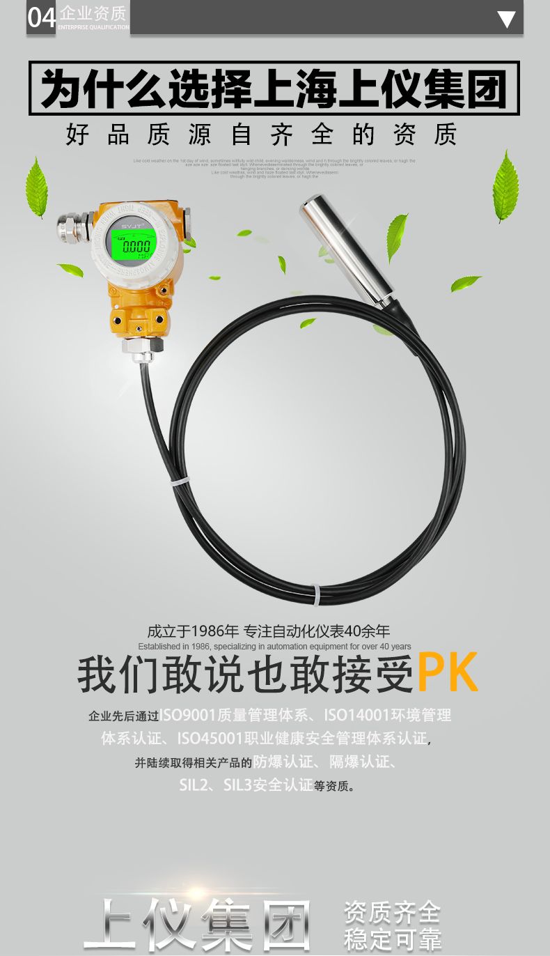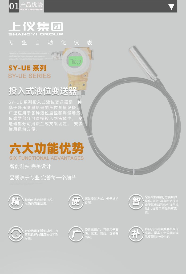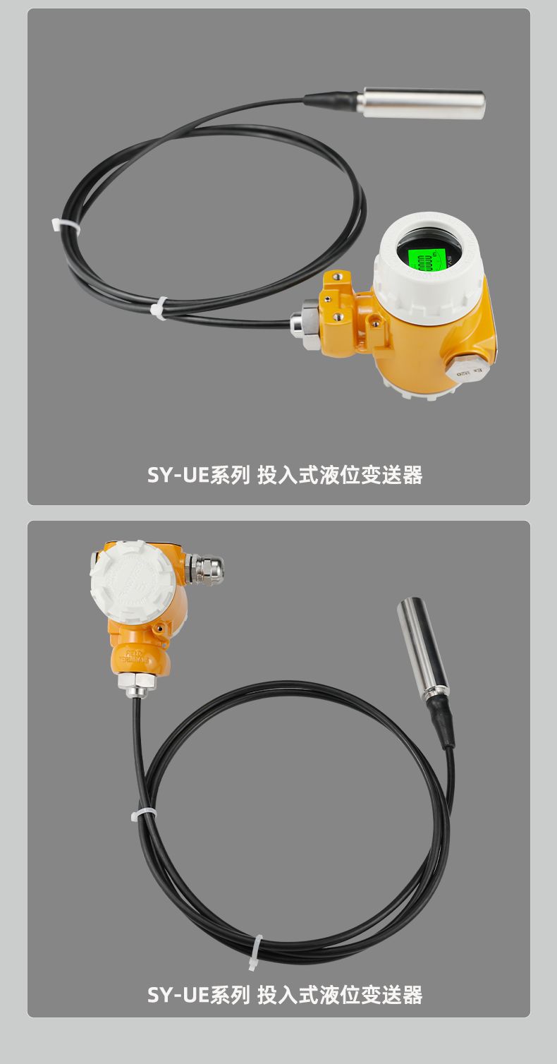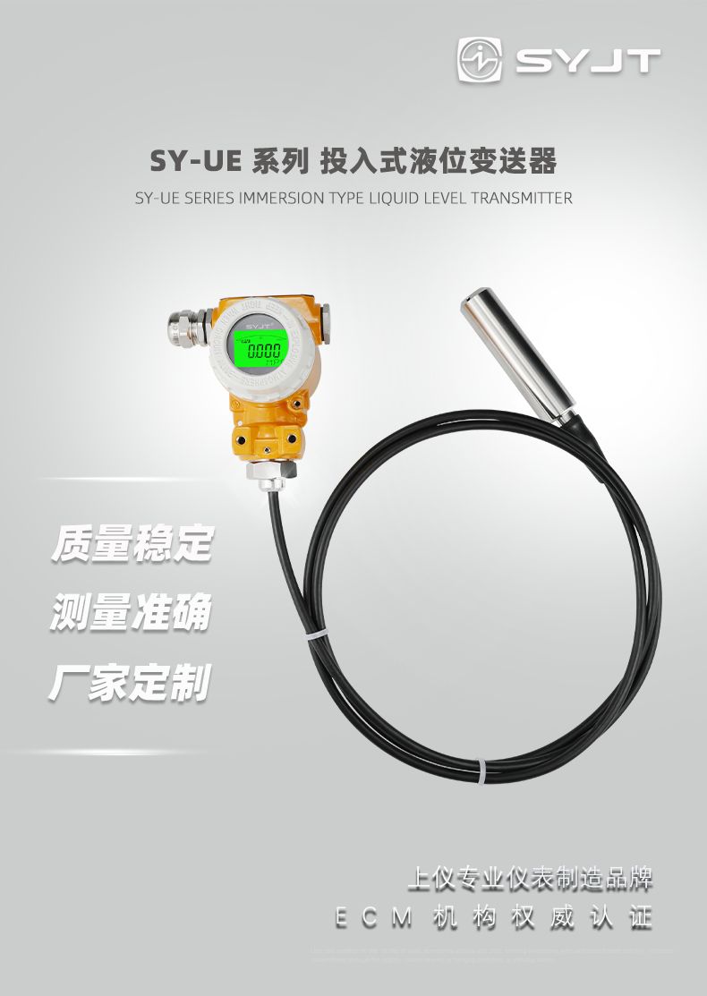 SY-UE系列投入式液位变送器采用先进电路处理技术,性能稳定、高灵敏度;多种量程,可测200m(水柱压力);采用316L不锈钢隔离膜片,适用于多种测量介质;配置灵活,根据需要可选择不同配置;一体式、分体式可选;反极性和过电压保护;抗冲击、防雷击设计;激光调阻温度补偿,零点、量程可现场调节;范围宽抗腐蚀,适于多种介质;过载及抗干扰能力强,性能稳定。